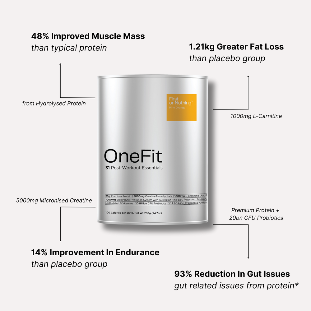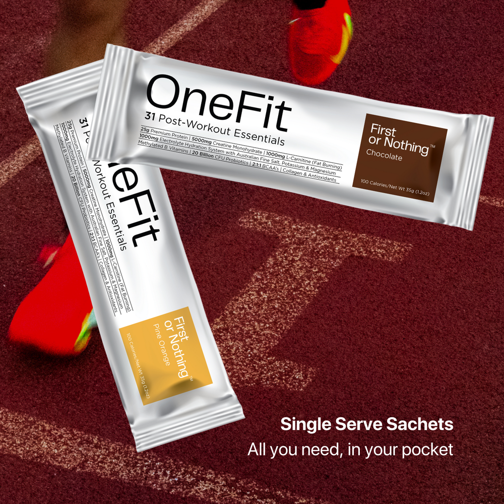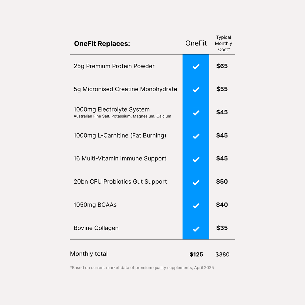 OneFit® simplifies your stack. It replaces protein, creatine monohydrate, an electrolyte drink, BCAAs, L-carnitine, and a daily multi—in one sachet.